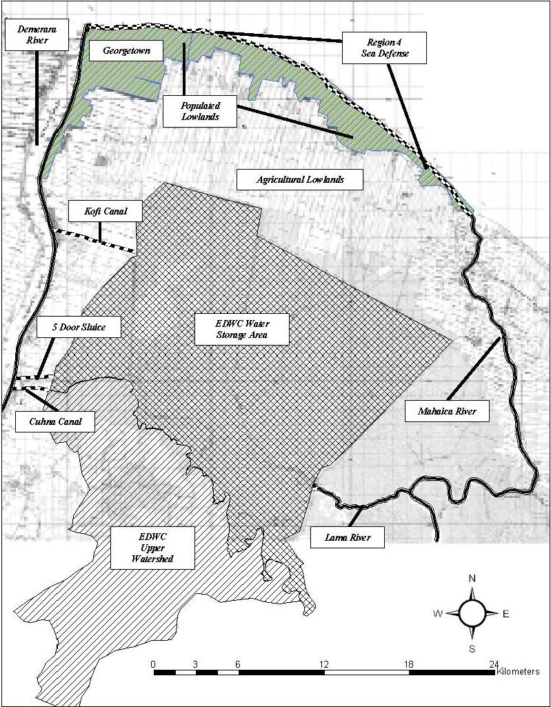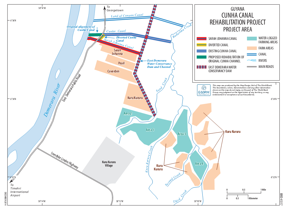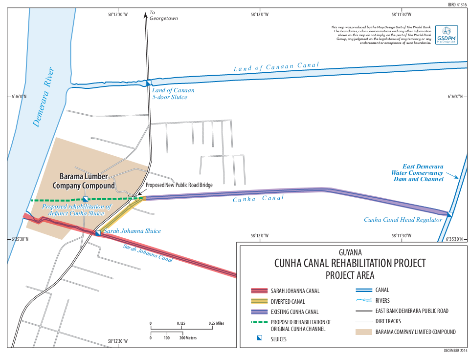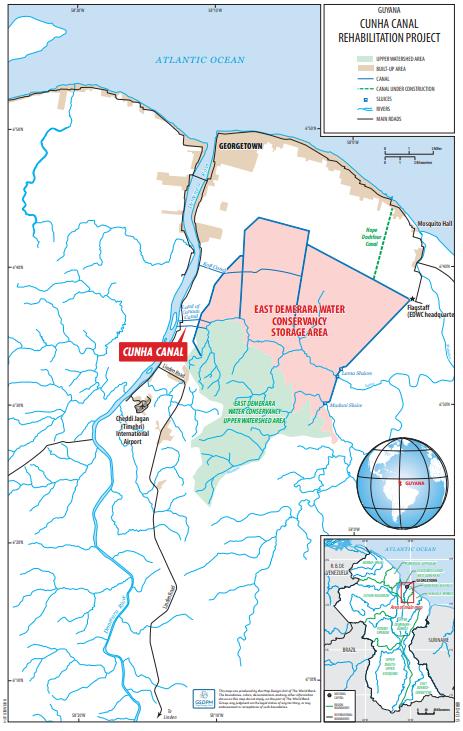 Rehabilitating the Cunha Canal will improve its discharge capacity, thereby improving the drainage capacity of the EDWC system. The EDWC is currently drained through only five outlets: the Lama and Maduni outlets draining into the Mahaica River to the east, and through the five-door Land of Canaan, Kofi and currently poorly-operational Cunha canals draining into the Demerara River to the west. Once operational, the Hope-Dochfour relief channel will allow further drainage into the Atlantic Ocean to the north. Rehabilitation of the Cunha Canal will allow additional discharge capacity into the Demerara River, helping to reduce the risk of water levels exceeding the safe operating level of the EDWC dam, which would stress the dam and potentially lead to catastrophic breaching and flooding. The beneficiaries in this case are principally the citizens of Georgetown (estimated population of 118,363 people, including the City and suburbs12), and residents, commercial and industrial establishments and farmers in the